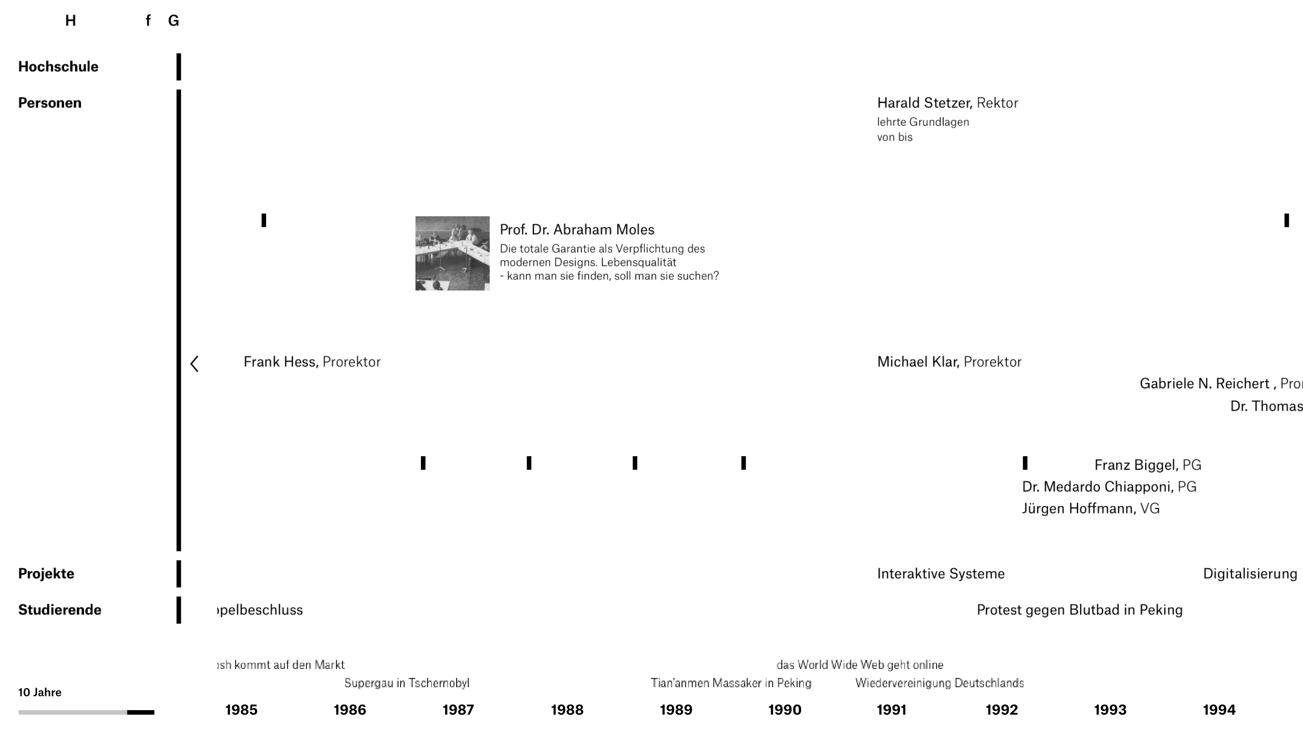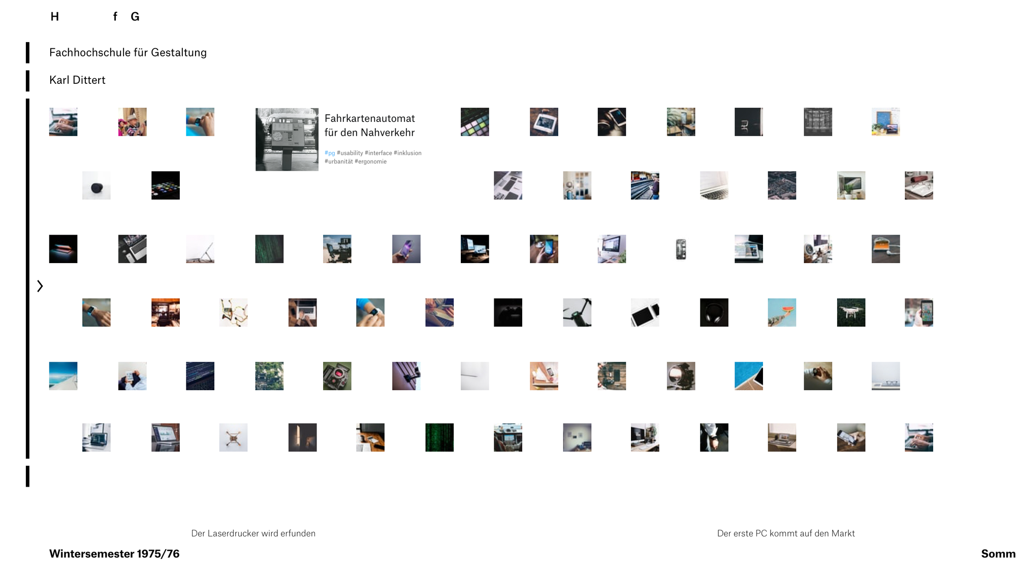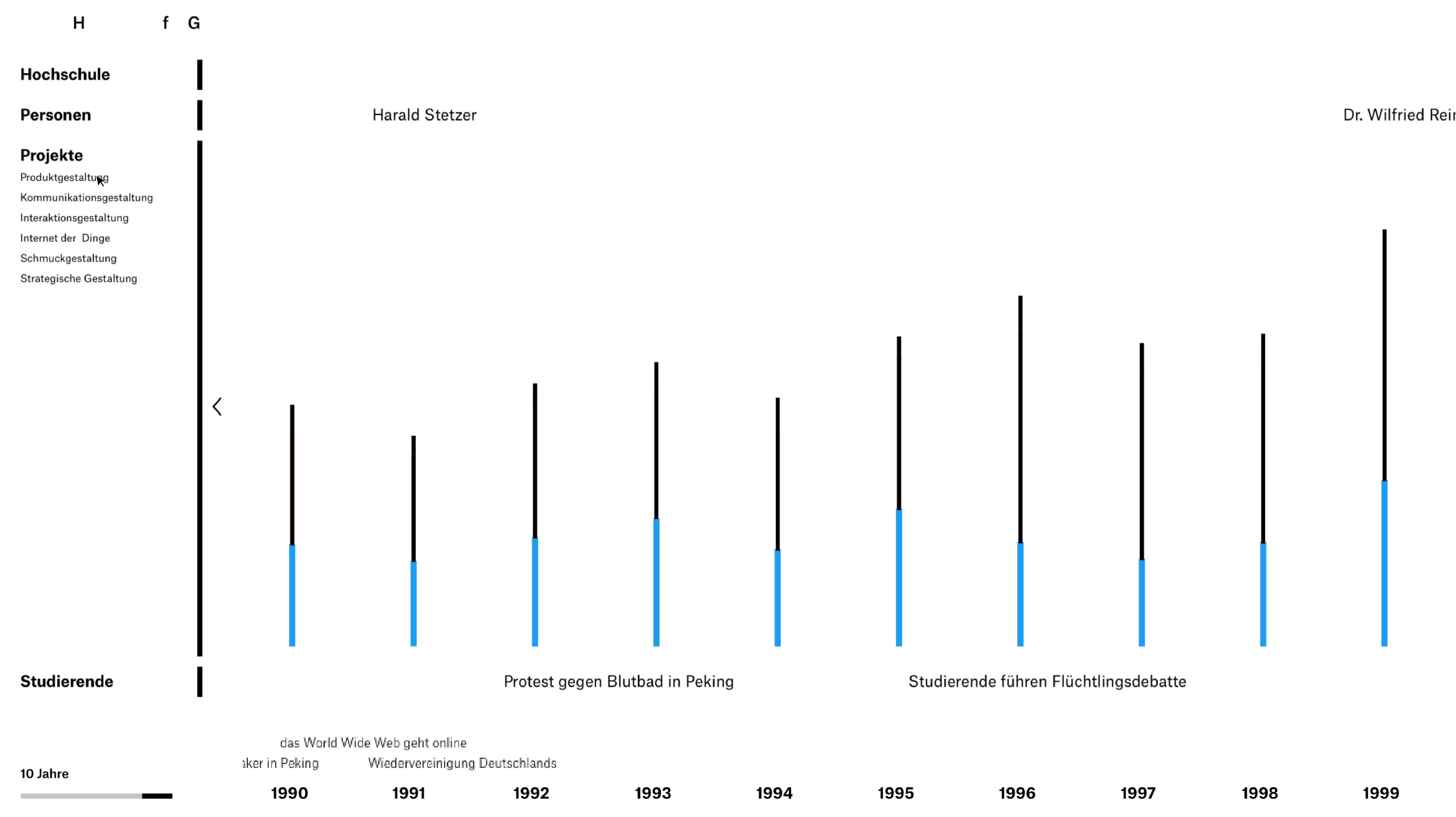 This project was a concept for the newly designed website of the HfG Schwäbisch Gmünd to present the history of the university. In addition to the changes in the structure of the university and the teaching staff, the website also includes, above all, the projects of the students and their activities in the context of contemporary history. For this purpose, the application accesses the university's internal archive and allows an insight into the change of the students' mindset. The user can move independently along the timeline and interactively discover the history of the institution and its developments.