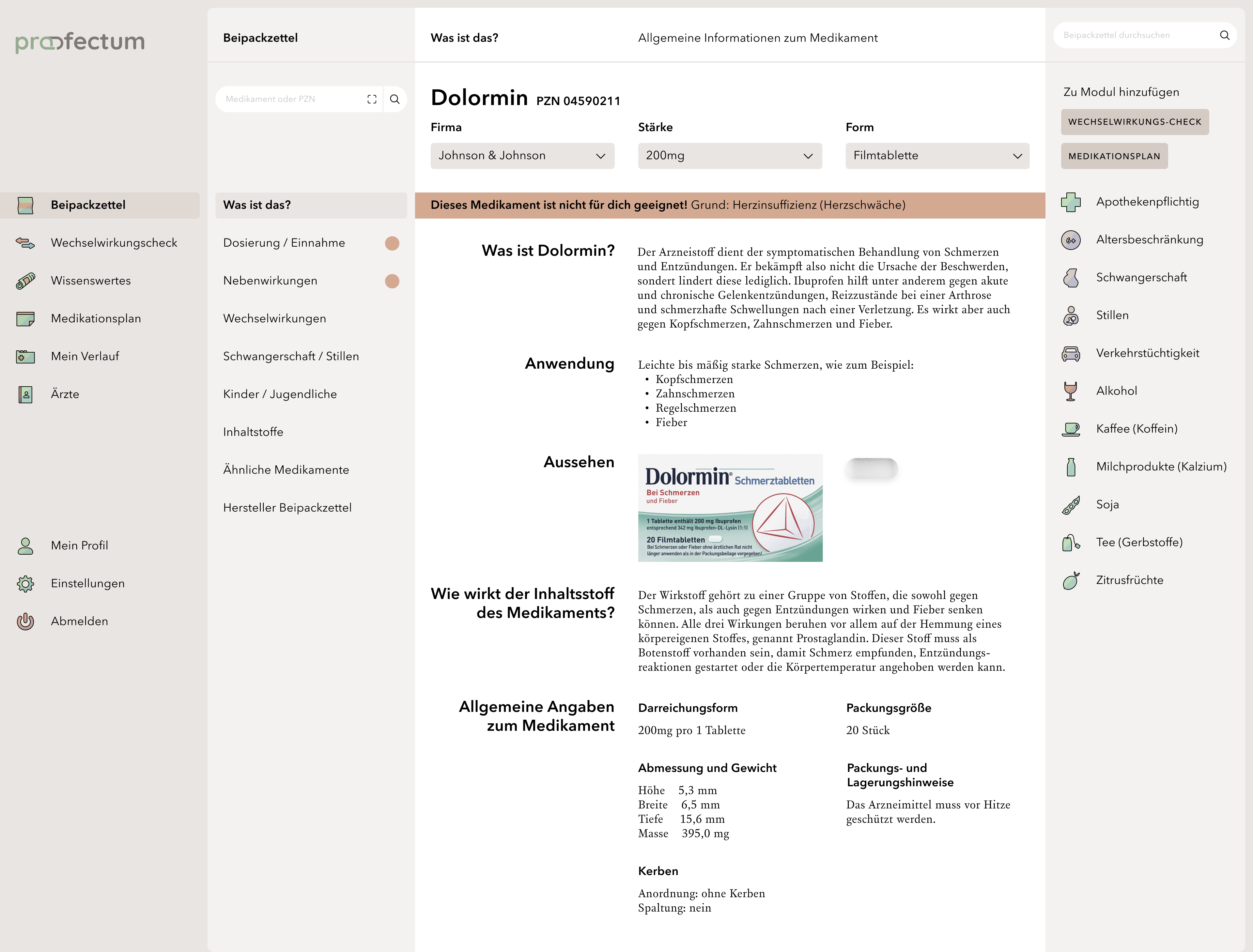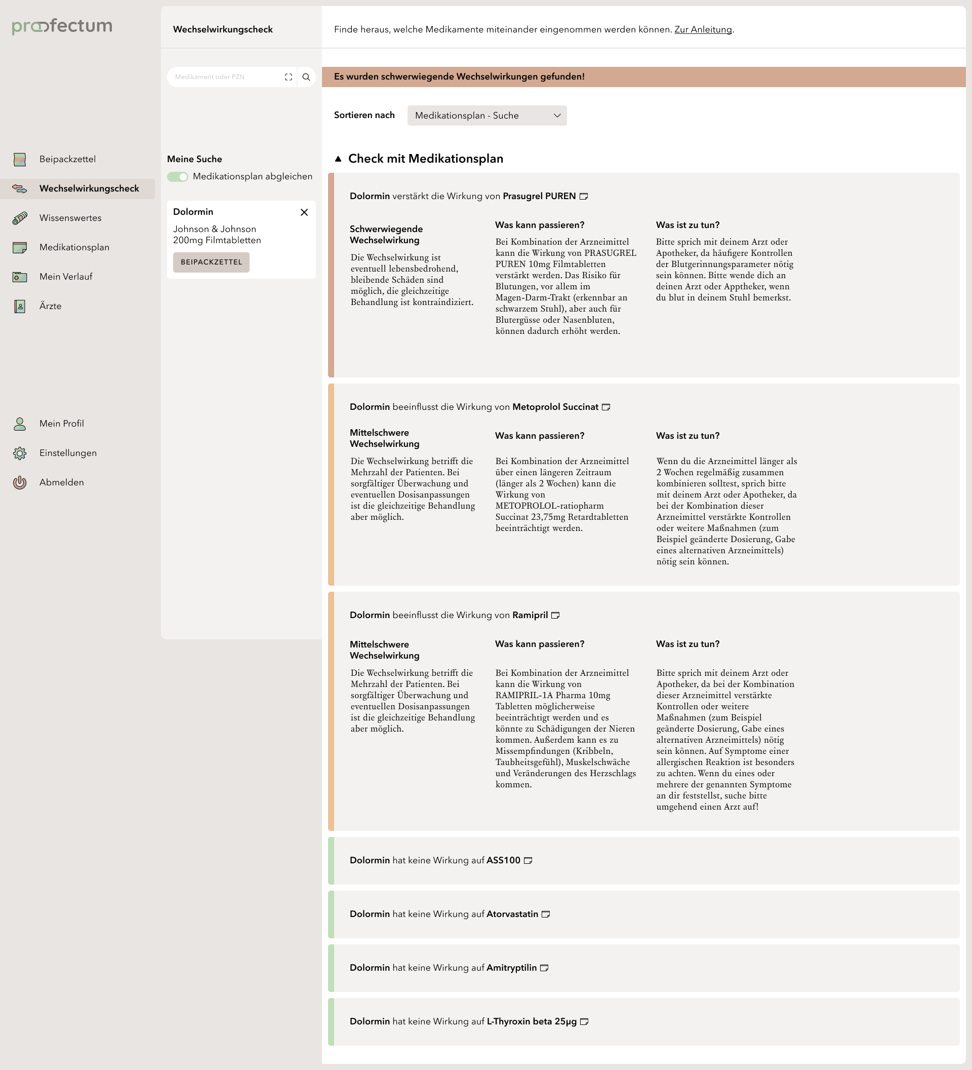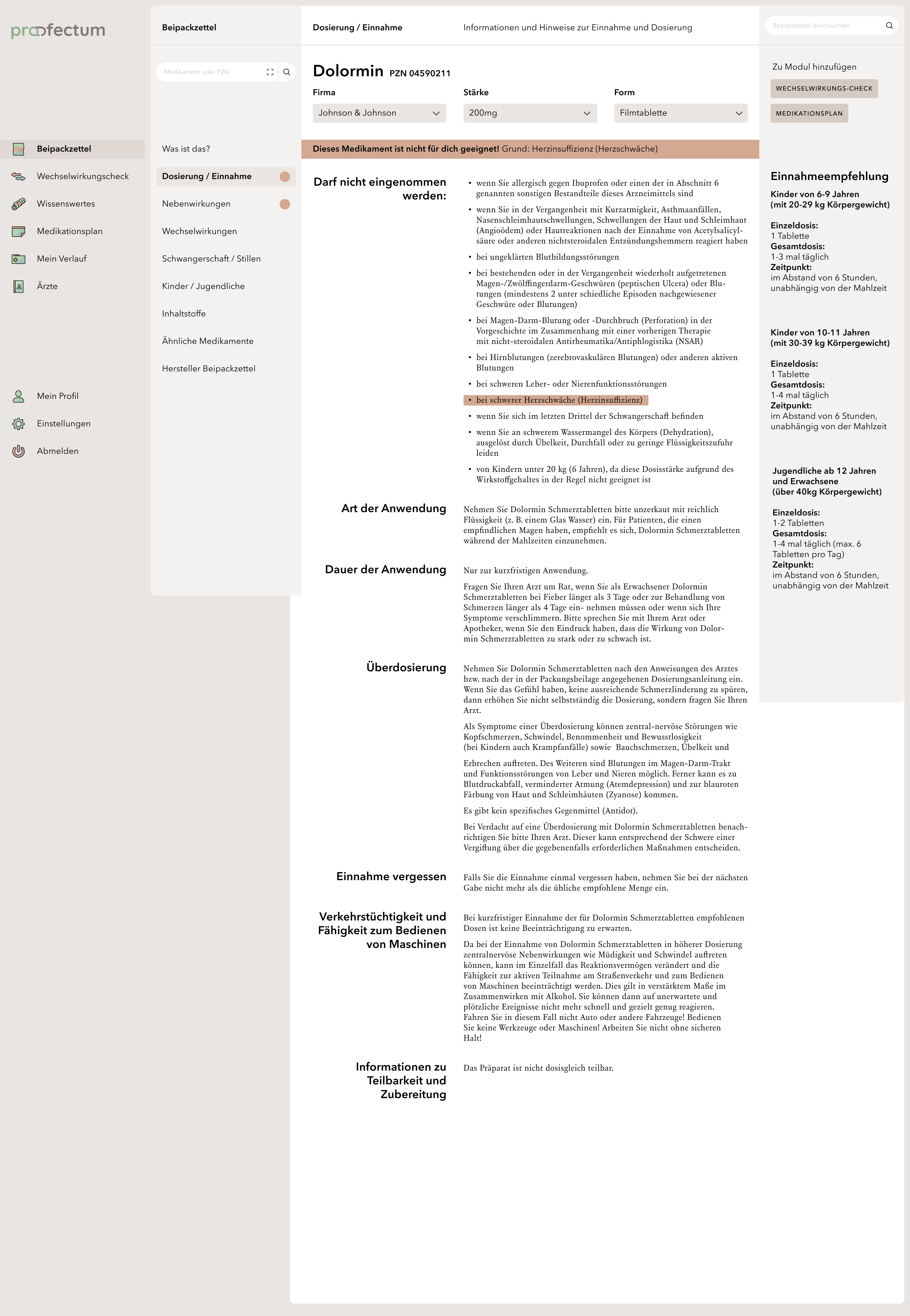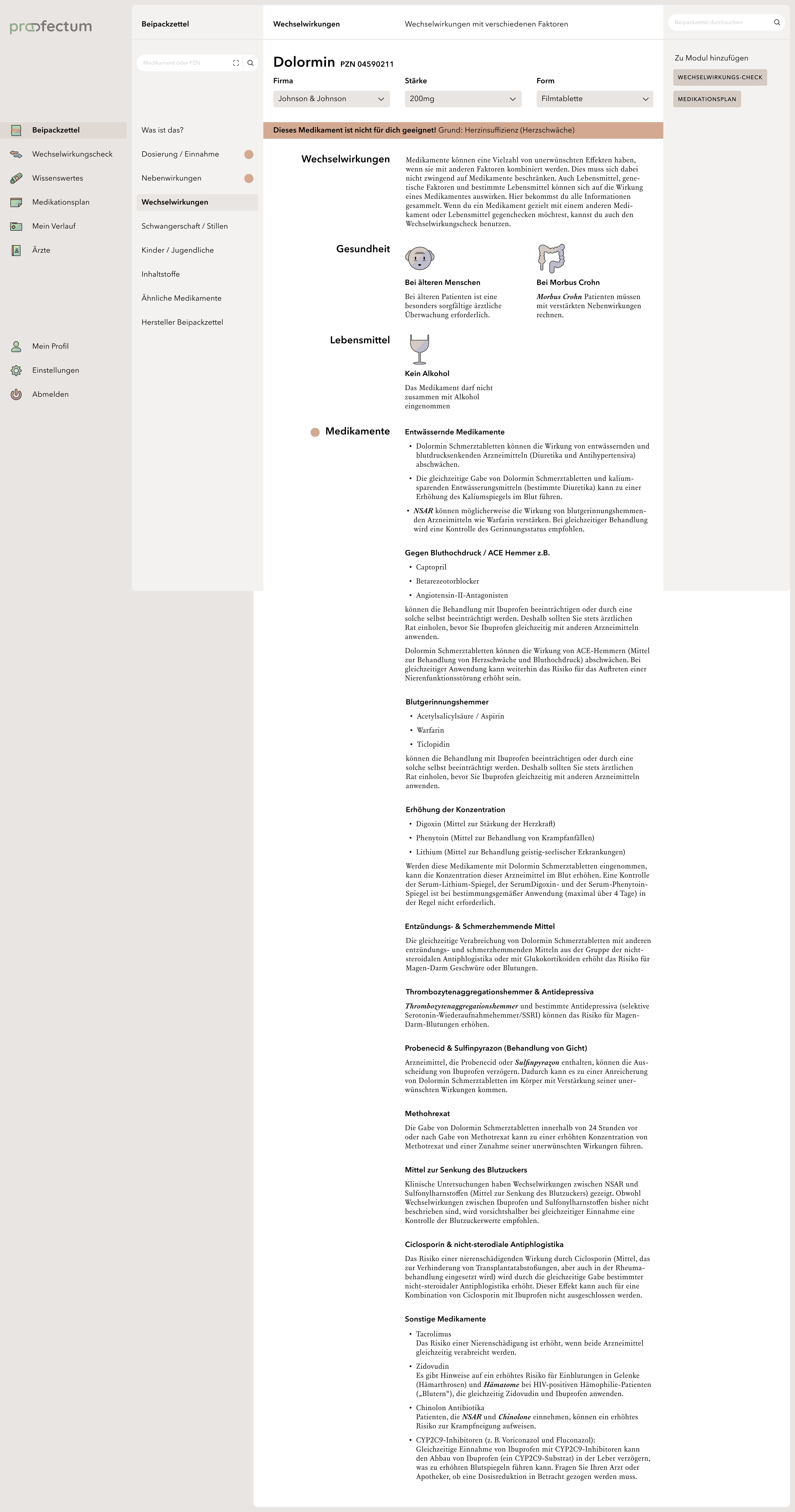 profectum is a project that focuses on the topic of poly- and comedication and the associated risks. Often, complete medication plans fail due to a lack of communication between doctors and pharmacists. Lack of knowledge about complications or information about the appropriate medications also tends to cause incorrect or harmful medications. The concept combines medication plans with information about the contained medications and possible interactions in one portal and is supposed to provide an overview of all information especially for the affected elderly target group. Users are able to save their data in order to get a deeper insight into their long-term medication as well as to access information about unrestricted medications without registration. This work is my bachelor thesis project.