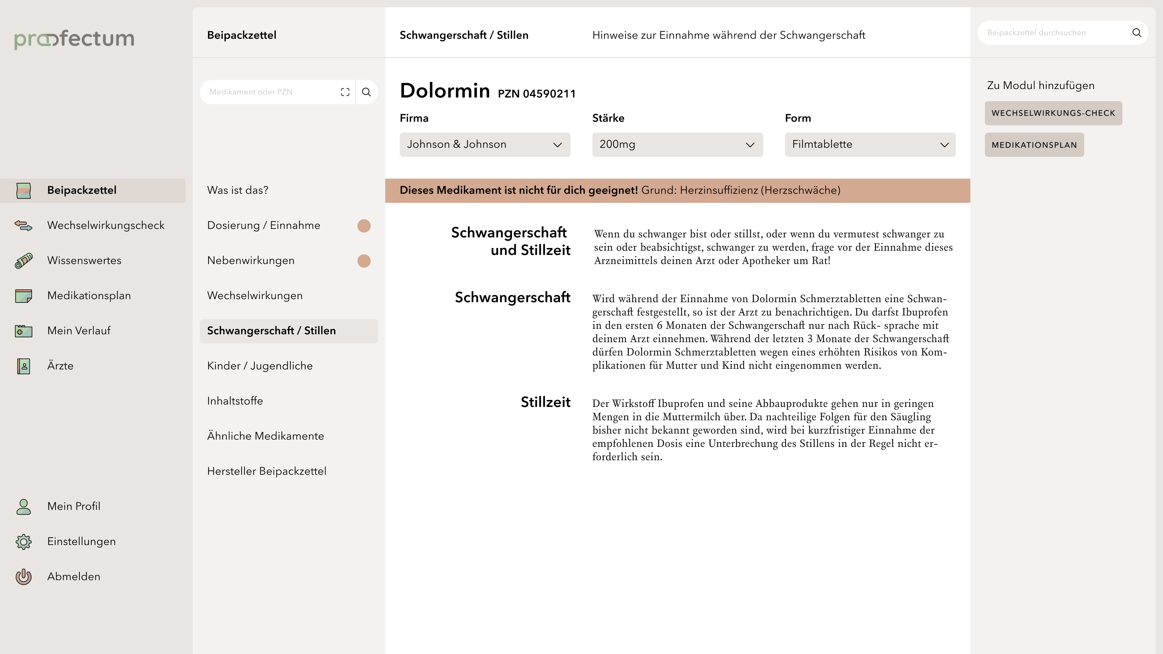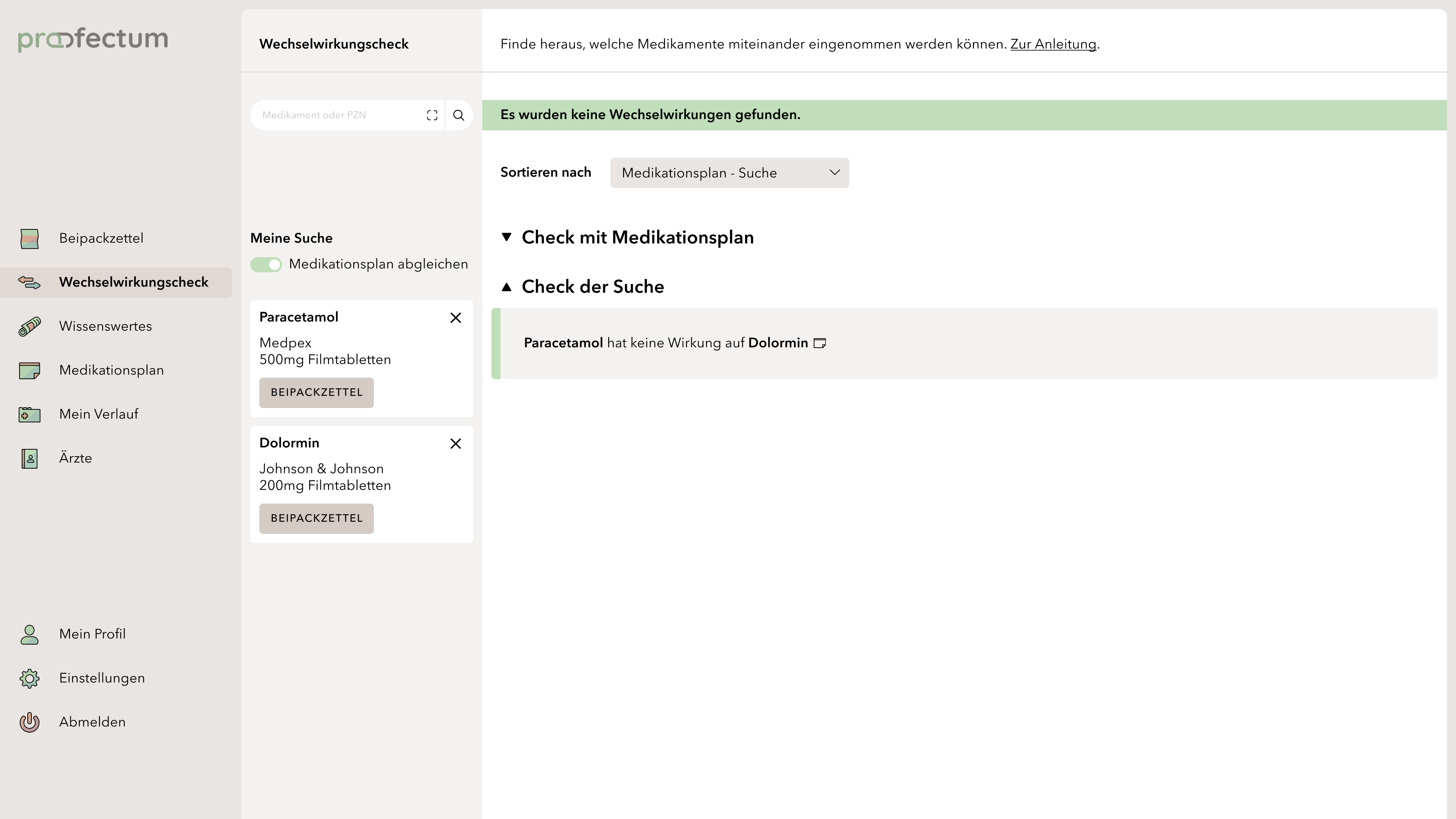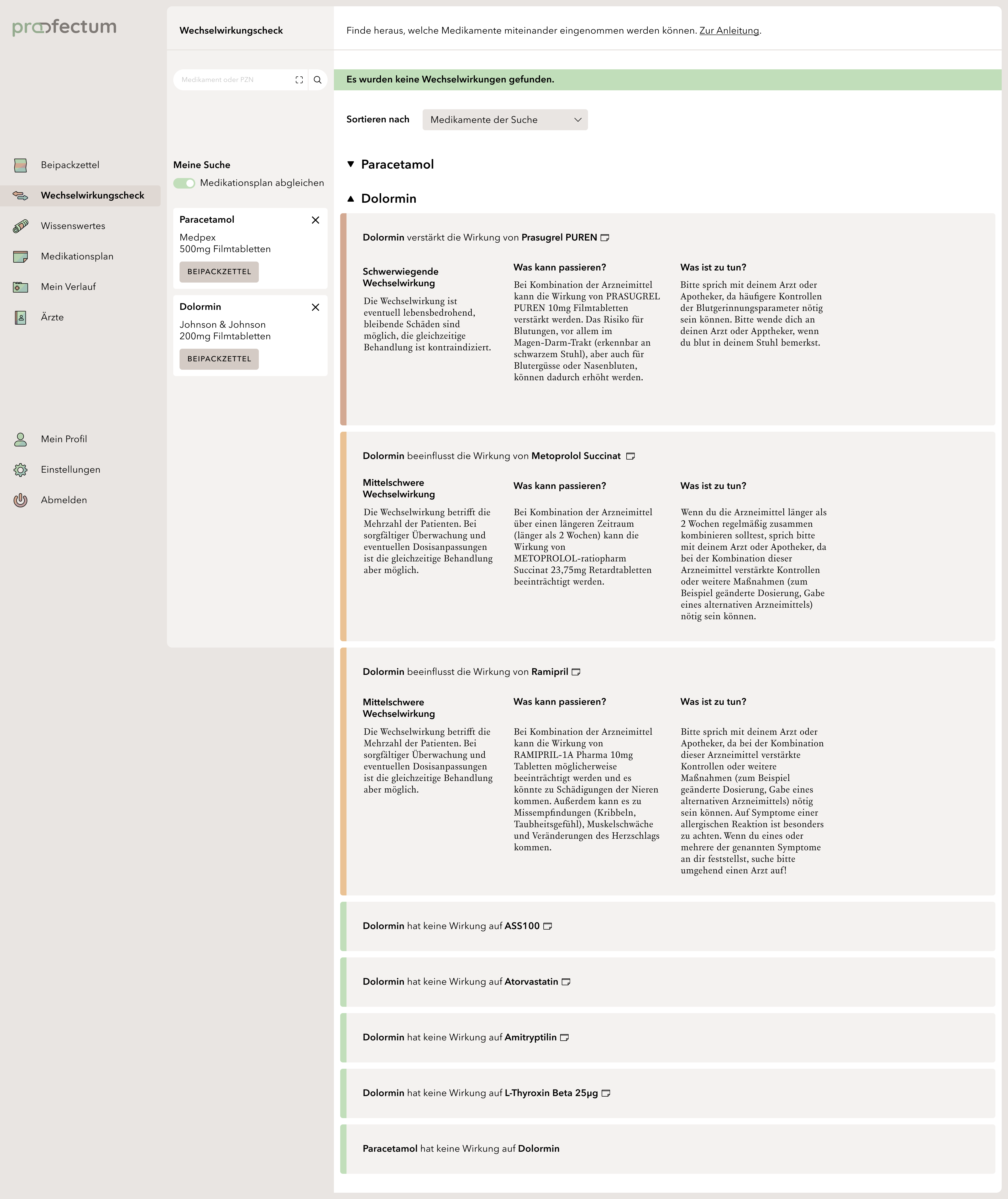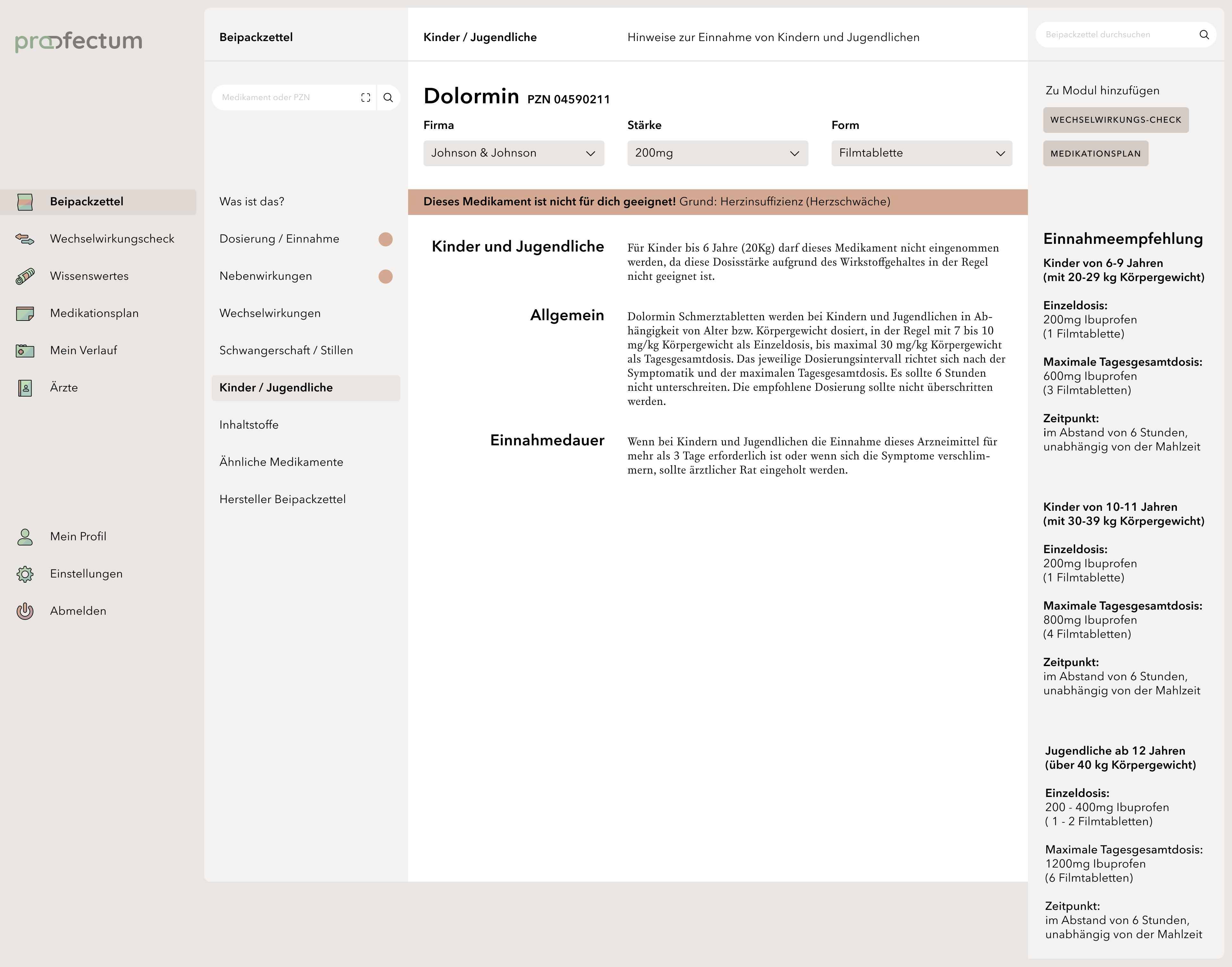 profectum is a project that focuses on the topic of poly- and comedication and the associated risks. Often, complete medication plans fail due to a lack of communication between doctors and pharmacists. Lack of knowledge about complications or information about the appropriate medications also tends to cause incorrect or harmful medications. The concept combines medication plans with information about the contained medications and possible interactions in one portal and is supposed to provide an overview of all information especially for the affected elderly target group. Users are able to save their data in order to get a deeper insight into their long-term medication as well as to access information about unrestricted medications without registration. This work is my bachelor thesis project.