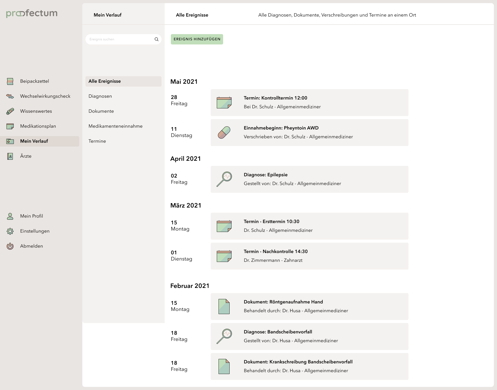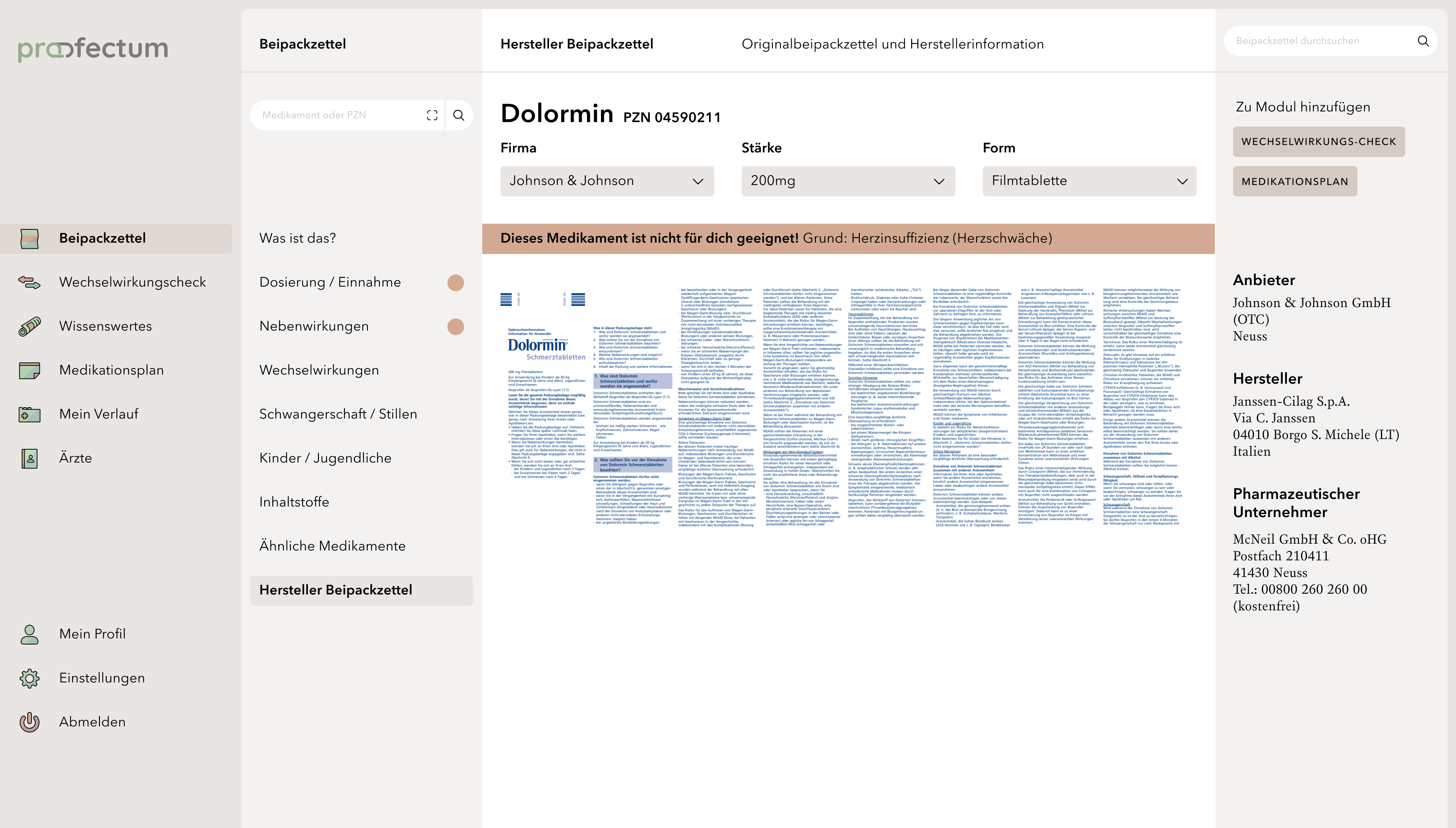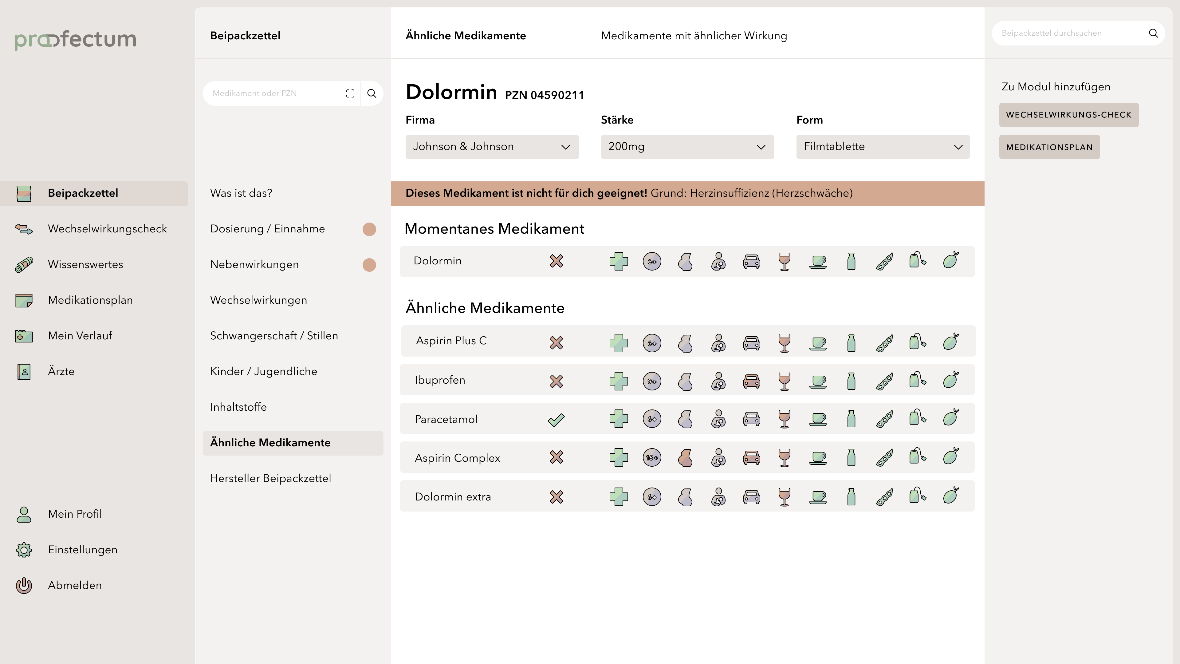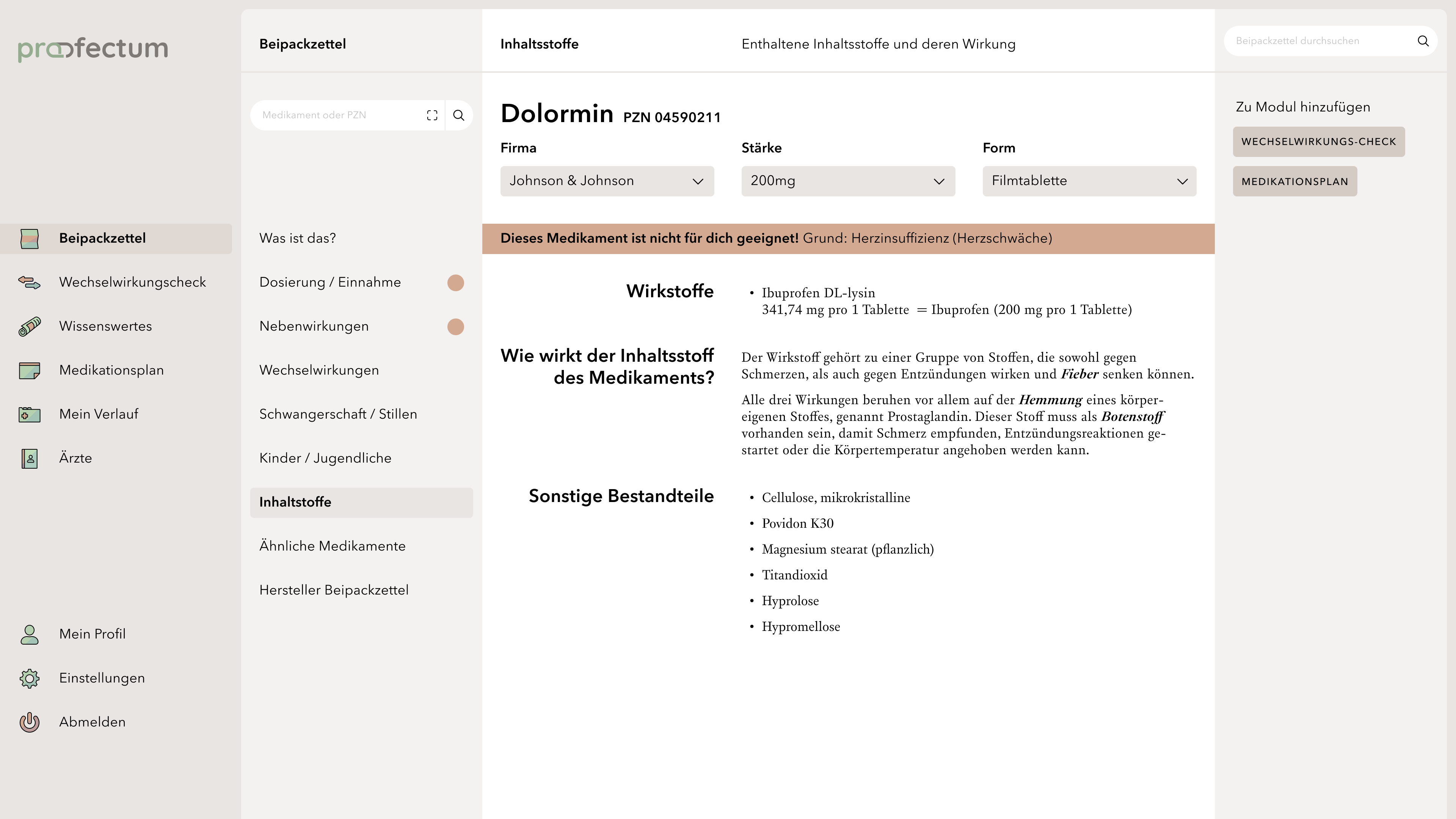 profectum is a project that focuses on the topic of poly- and comedication and the associated risks. Often, complete medication plans fail due to a lack of communication between doctors and pharmacists. Lack of knowledge about complications or information about the appropriate medications also tends to cause incorrect or harmful medications. The concept combines medication plans with information about the contained medications and possible interactions in one portal and is supposed to provide an overview of all information especially for the affected elderly target group. Users are able to save their data in order to get a deeper insight into their long-term medication as well as to access information about unrestricted medications without registration. This work is my bachelor thesis project.