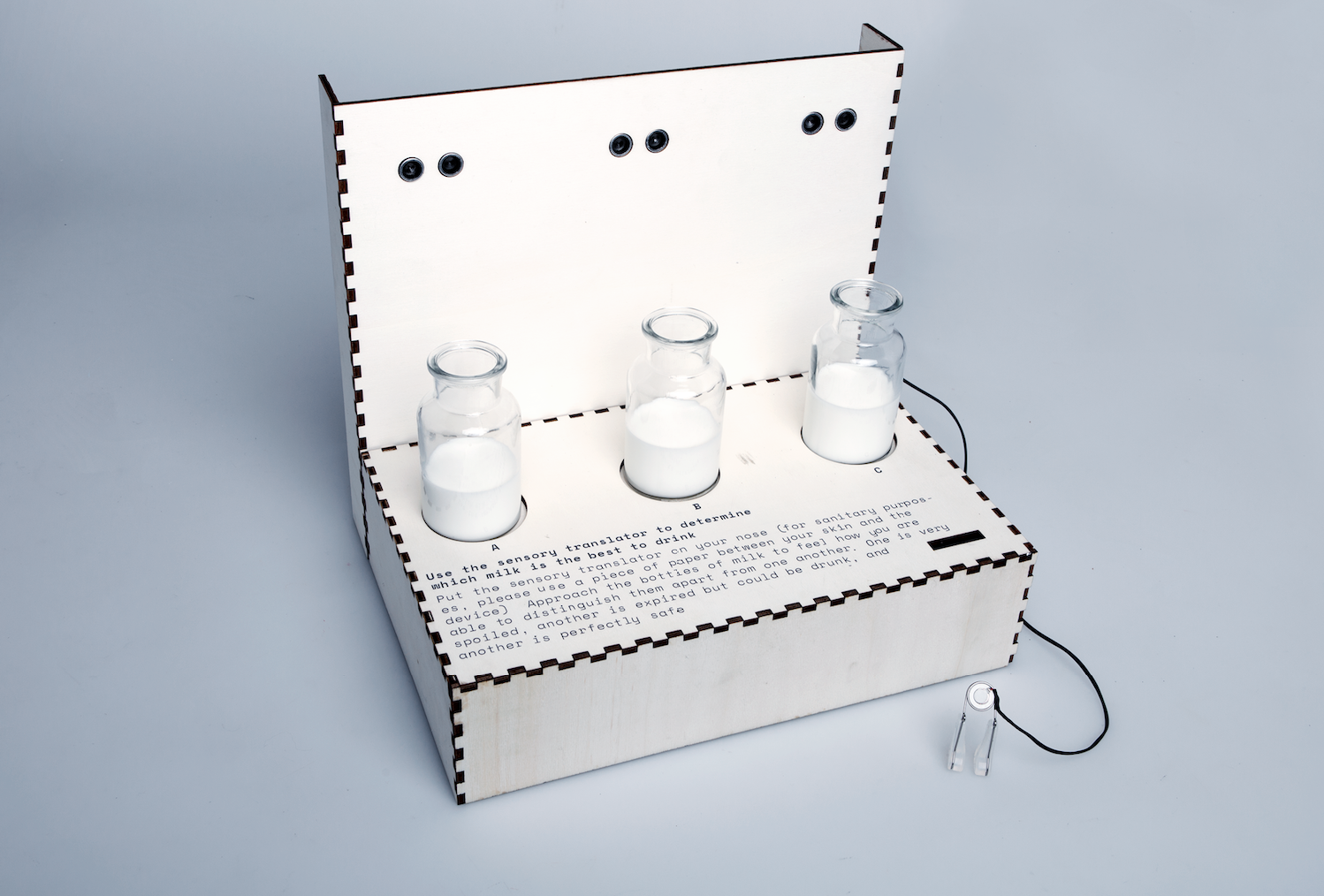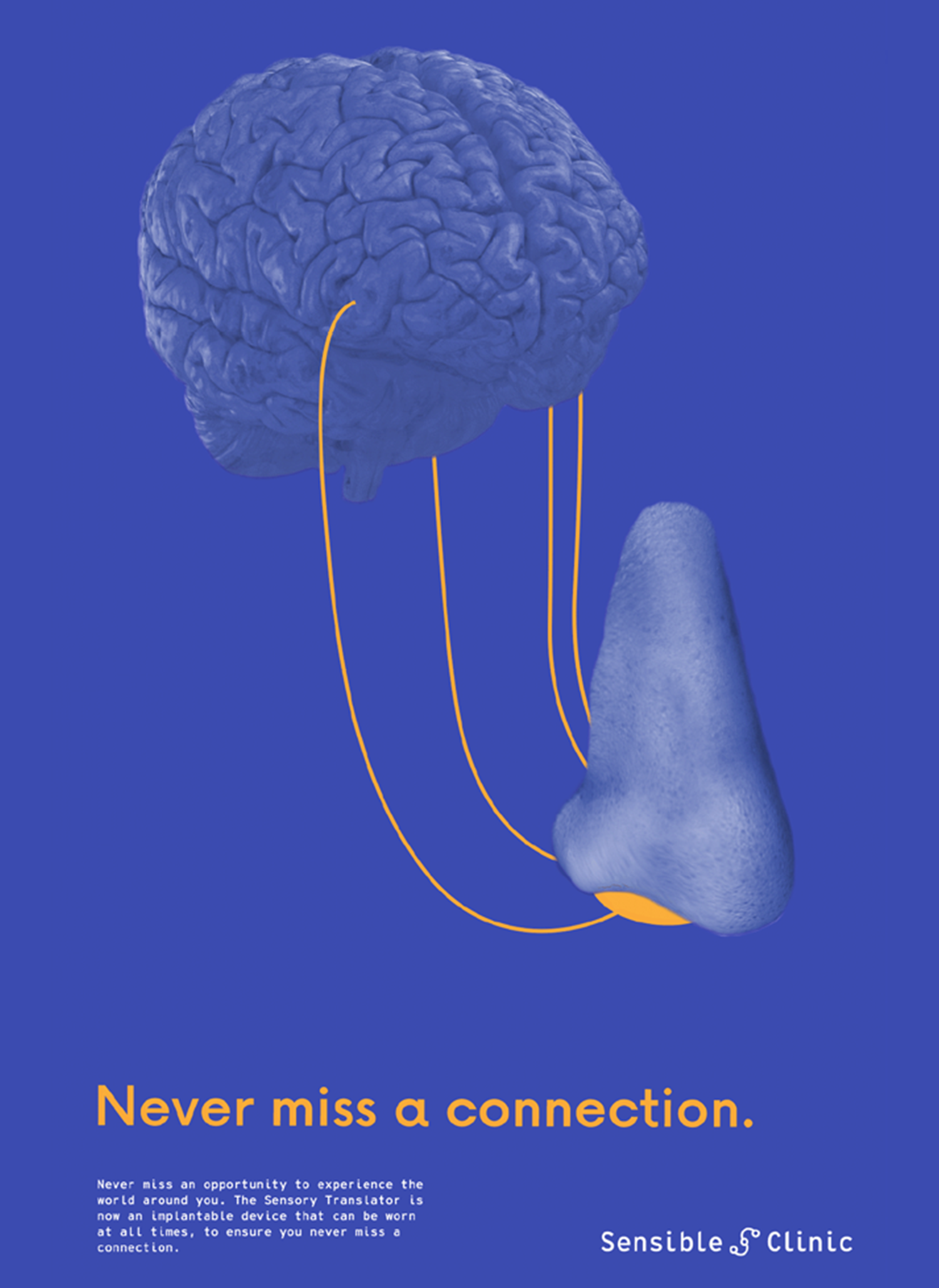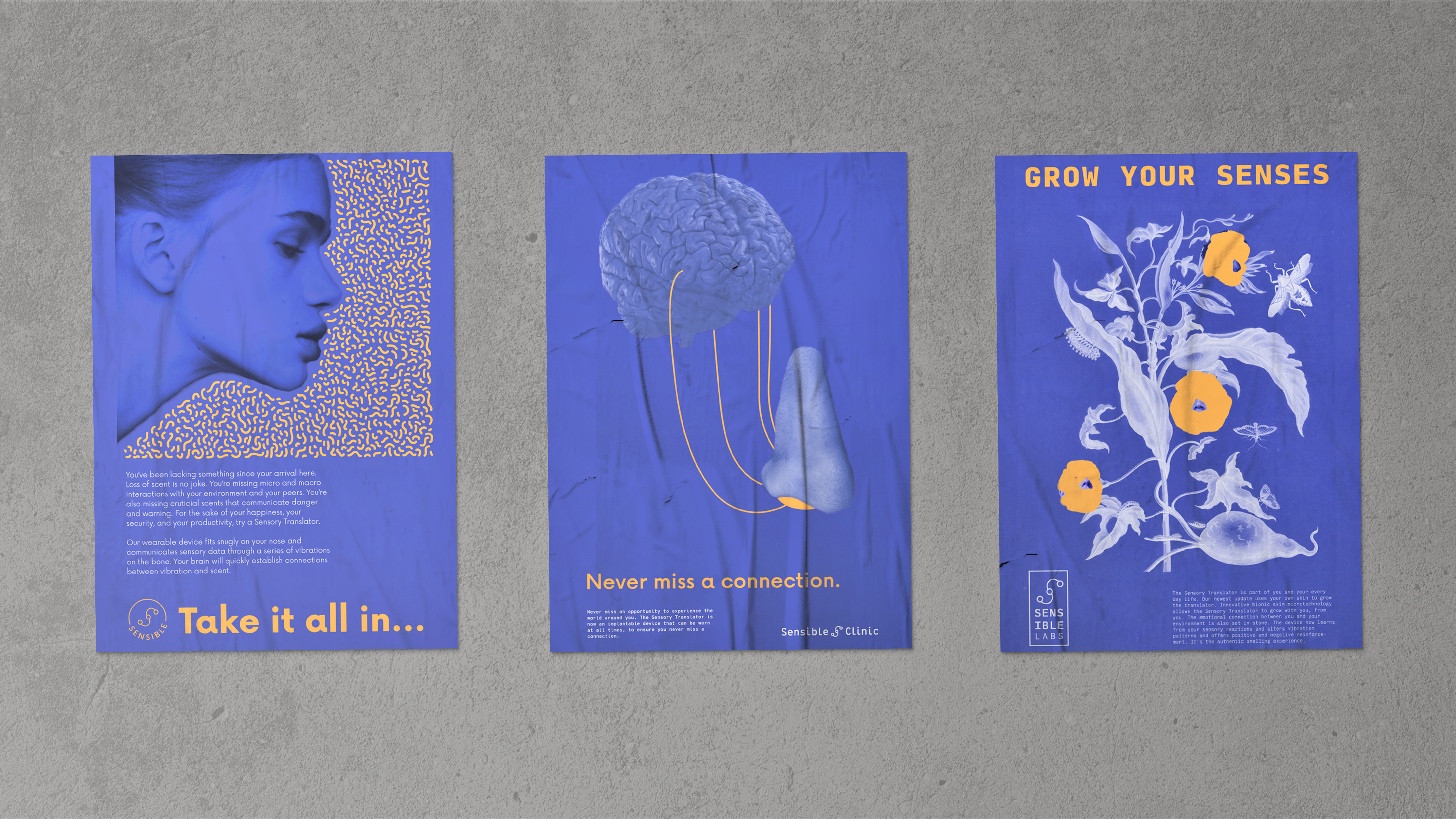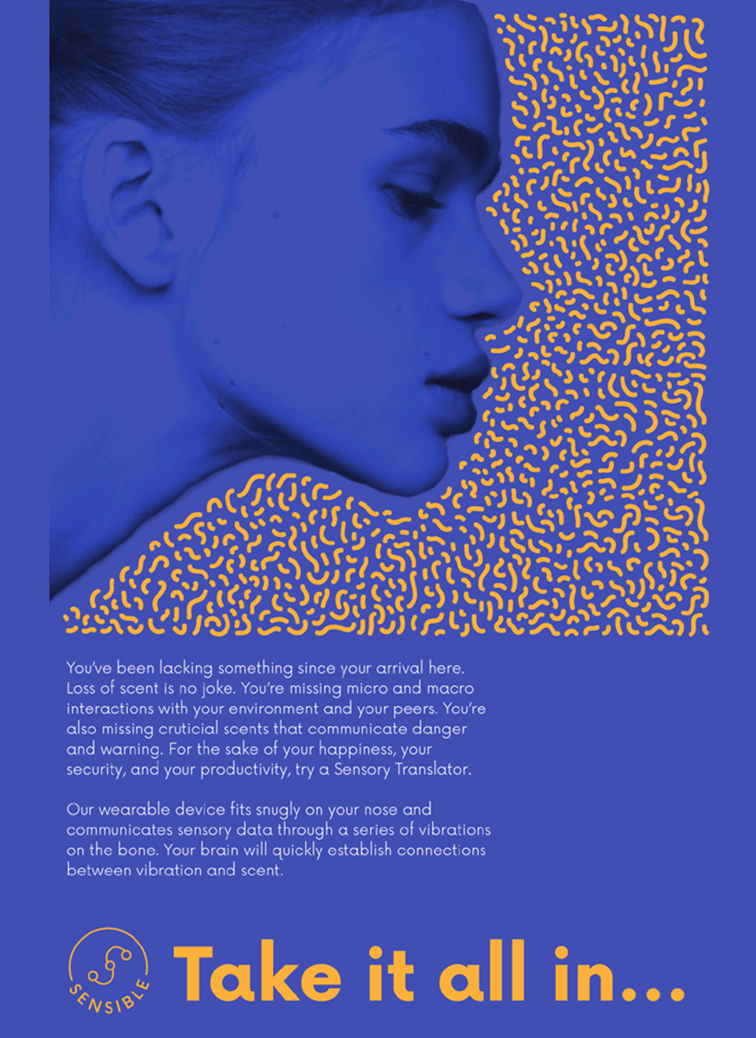 sense and sensability takes up a speculative scenario in which the human sense of smell is influenced and destroyed by various environmental influences. The design concept refers to the development of a solution over a period of three generations in which both the product and the attitude of the people change. According to the circumstances, the project changes from a wearable that is only used for certain situations and has only a small range of signals to an implant. This is able to re-establish a link with emotions by translating the information into other stimuli. On the basis of two prototypes, both the product of the first generation and the final development can be experienced on one's own body.